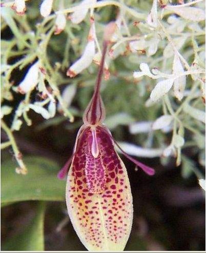 Found in Norte de Santander Colombia and Peru in cloud forests at elevations around 1100 to 1750 meters as a mini-miniature sized, warm to cool growing epiphyte with erect ramicauls enveloped by 3 to 6, loose, compressed, more or less spotted, more or less imbricating sheaths and carrying a single, apical, erect, coriaceous, yellow-green, elliptical-ovate, subacute to obtuse, broadly cuneate then contracted below into the twisted petiolate base leaf that blooms in the spring on a 1 to 1.4" [2.5 to 3.5 cm] long, successively single flowered inflorescence arising from behind the leaf and has a thin, tubular floral bract