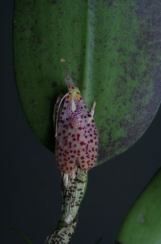 Found in Antioquia Colombia in cloud forests at elevations around 1800 to 2000 meters as a mini-miniature sized, cool growing epiphyte with erect ramicauls enveloped by 6 to 9 thin, whitish, loose, compressed, densely spotted, more or less imbricating sheaths and carrying a single, apical, erect, thickly coriaceous, purple suffused beneath, ovate,a cute, broadly cuneate to rounded below and contrtacted into the petiolate base leaf that blooms in the spring on a fascile of slender, successively single flowered inflorescence arising from low on the back of the leaf and has a thin, tubular floral bract