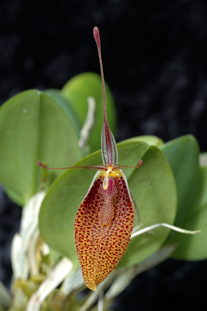 Found from Venezuela, Colombia and Peru as a miniature sized, variable in size and flower color, caespitose, hot to warm growing epiphyte in wet montane forests at elevations around 700 to 2800 meters with the ramicaul enveloped by large, compressed, scarious sheaths and a single, apical, ovate-elliptic, minutely tridentate leaf that blooms on an apical, 2" [5 cm] long, erect to spreading, single flowered inflorescence subtended by large, white, amplexicaul, tubular bracts that has fasciculate, single flowers that appear sequentially occuring in the fall and early winter and the flowers are held above the leaves.