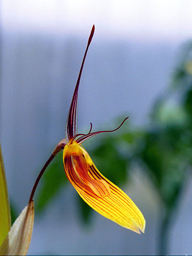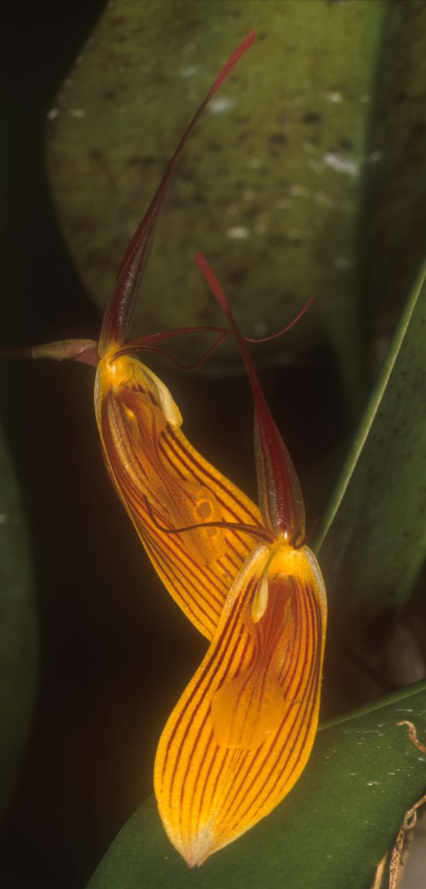 Found in Antioquia Colombia in the central cordillera at elevations around 1000 to 2000 meters as a medium sized, warm to cool growing epiphyte with erect, stout ramicauls enveolped basally by 8 to 12, whitish, loose, compressed, oblique, imbricating, intensely spotted purple brown on lower sheaths and carrying a single, apical, erect, coriaceous, purple suffused beneath, ovate, acute to subacute, cuneate base and contracted into the twisted petiolate base leaf that blooms in the spring and fall on a slender, erect, held in a fascile, 1.6" to 2.4" [4 to 6 cm] long, successively single flowered inflorescence arising on the back of the leaf and carrying a thin tubular floral bract.