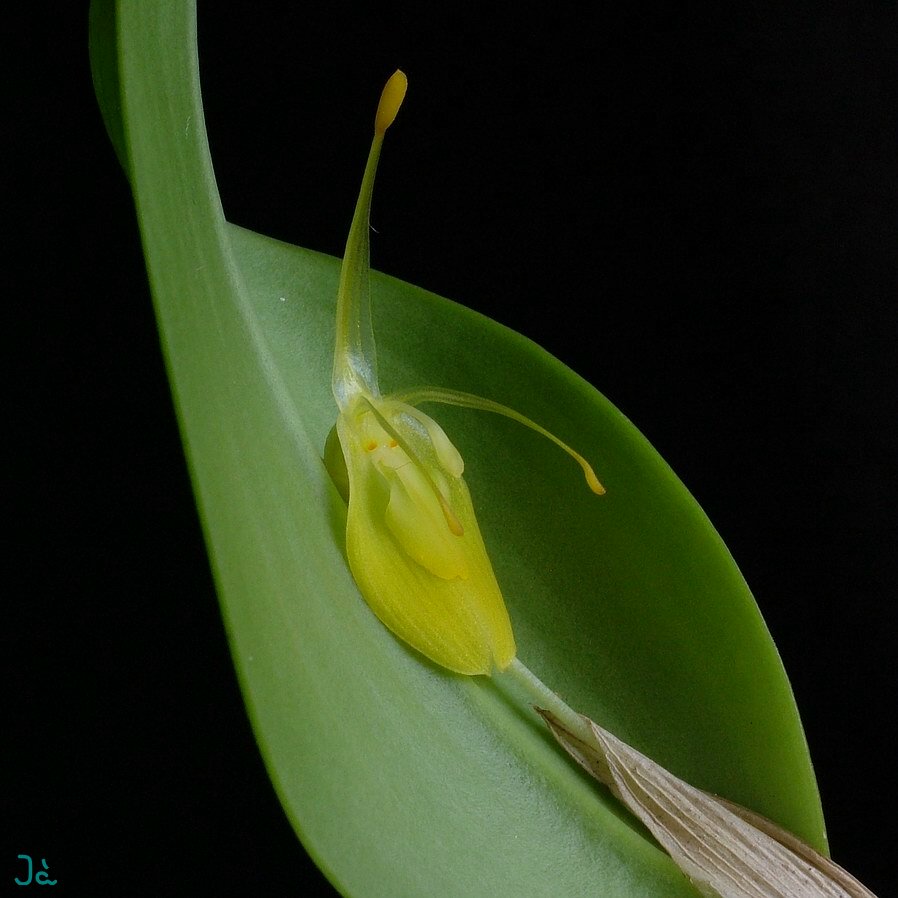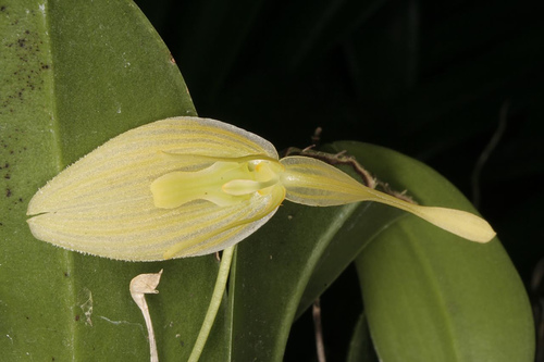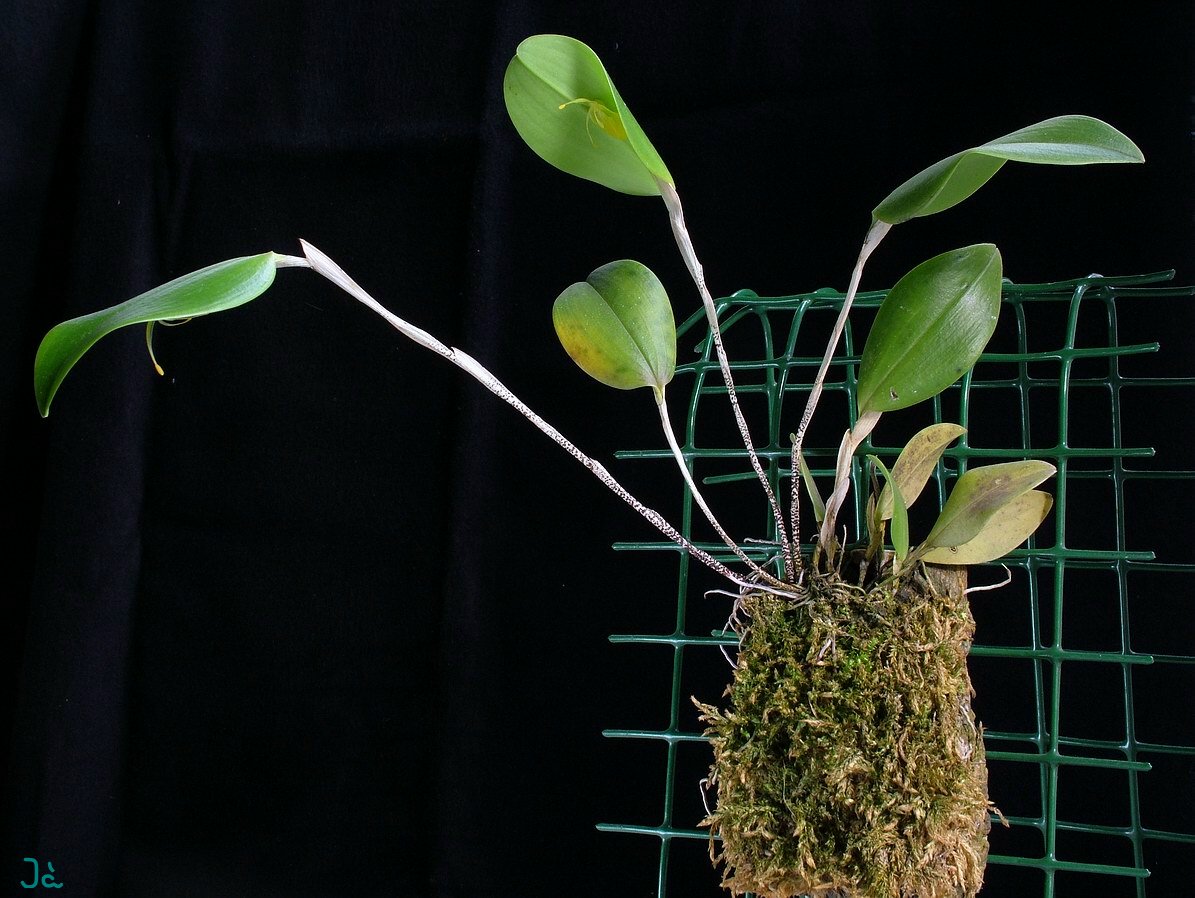 Found as a cloud forest, small to medium sized, warm to cool growing epiphyte at elevations of 1200 to 1800 meters in Valle de Cauca Colombia and Ecuador with erect, stout, ramicauls enveloped basally by 6 to 8, thin, whitish, loose, oblique, compressed, brown spotted, somewhat imbricating sheaths and carrying a single, apical, erect, coriaceous, ovate, acute, broadly cuneate or rounded base contracted intothe twisted petiolate base leaf that blooms in the fall and winter on a slender, .8 to 1.3" [2 to 2.8 cm] long, successively single flowered inflorescence arising in a fascile on the back of the leaf and carrying a thin, tubular floral bract.