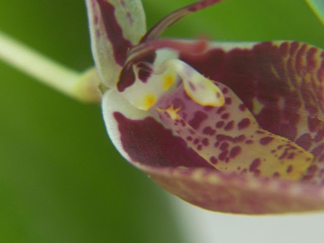 Distinguished more by the 3 to 4 small process arising from a common base that are at the base of the lip than the black spots on the sepals which not all flowers have.