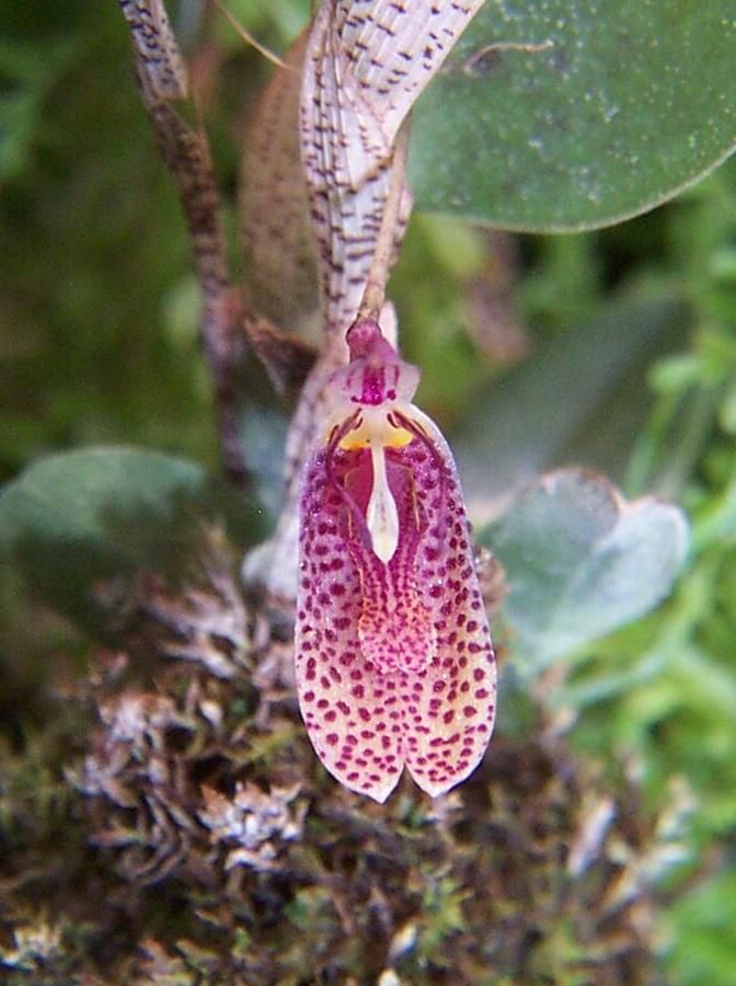 Found in Ecuador without locality as a mini-miniature sized epiphyte with erect ramicauls enveloped by 5 to 7, thin, white, loose, oblique, acute, compressed, brown speckled, imbricating sheaths and carrying a single, erect, coriaceous, elliptical-ovate, subacute, cuneate below into the petiolate base leaf that blooms in the fall on a slender, erect, 1 to 1.4" [2.5 to 3.5 cm] long, fascile of successively single flowered inflorescence with a thin, tubular floral bract.