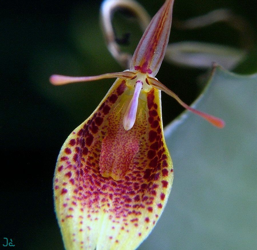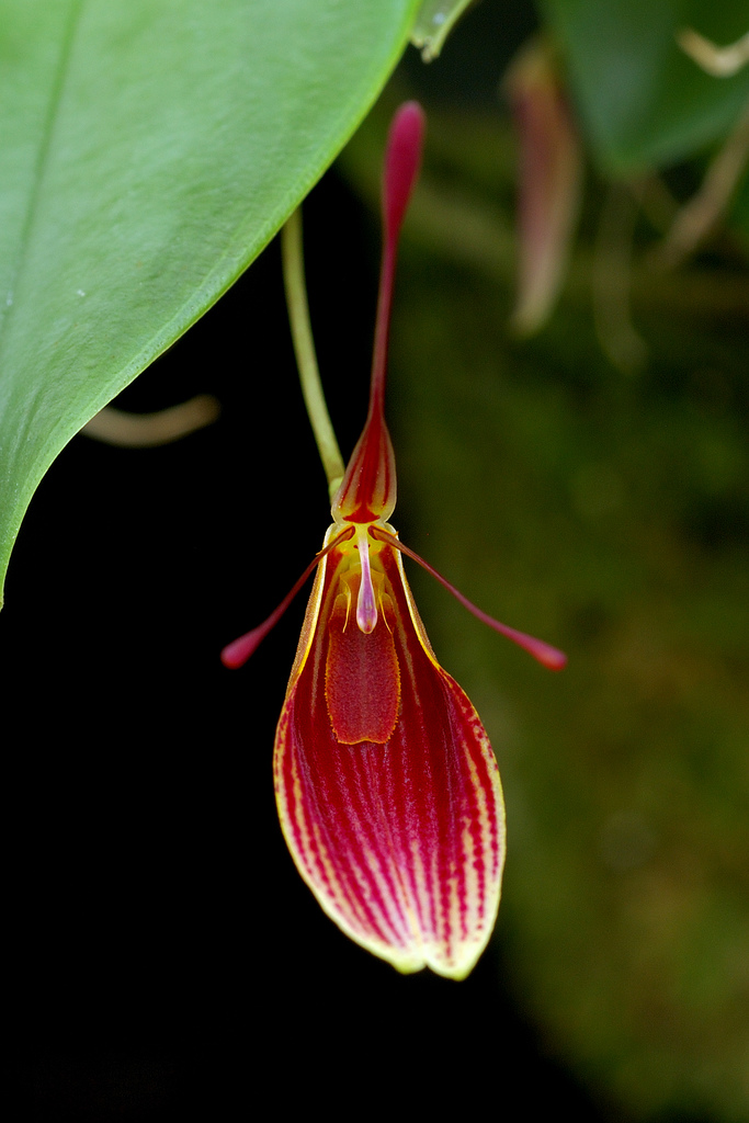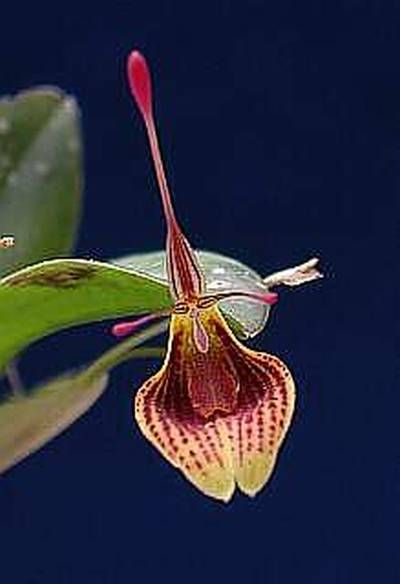 A Ecuadorian, miniature sized, warm to cool growing, cloud forest epiphyte at elevations of 1400 to 2500 meters with erect, ramicauls enveloped basally by 5 to 6 , thin, pale, unspotted, loose, compressed, somewhat imbricating sheaths carrying a single, apical, erect, coriaceous, purple suffused beneath, elliptical-ovate, subacute, broadly cuneate below and contracted into the twisted petiolate base leaf that blooms in the summer on a slendre, 1.2 to 1.4" [3 to 3.5 cm] long, successively single flowered inflorescence arising onj the back of the leaf and held in a fascile and carrying a thin, tubular floral bract.