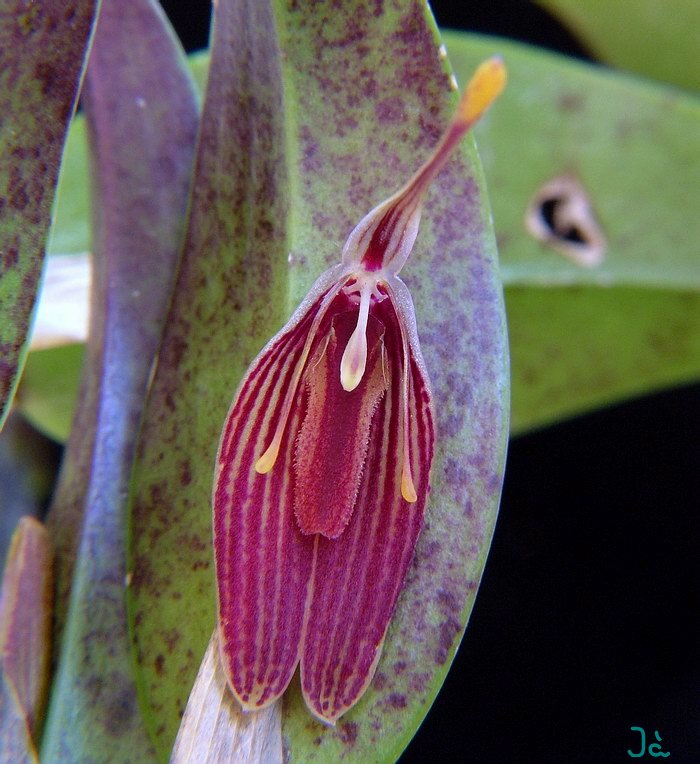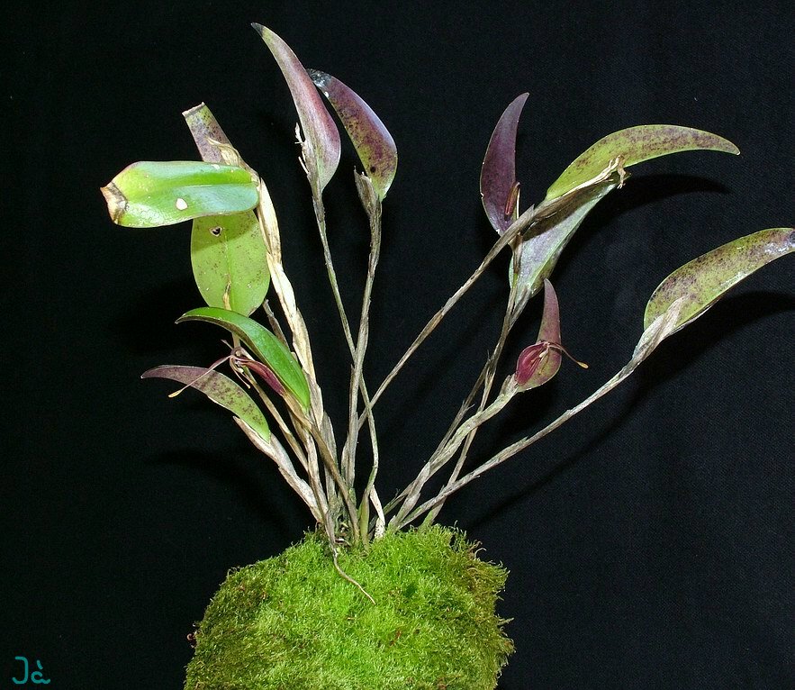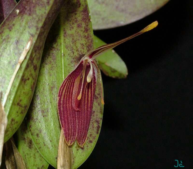Found in Risaralda Colombia in cloud forests at elevations of 1800 to 2200 meters as a miniature sized, cool to cold growing epiphyte with erect ramicauls enveloped completly by 6 to 8 , thin grey, loose, compressed, oblique, distichous sheaths and carring a single, apical, erect, coriaceous, purple suffused beneath, narrowly ovate, acute, slightly acuminate, broadly cuneate to rounded and twisted below into the petiolate base leaf that blooms in the spring and fall on a fascile, on the back of the leaf, successively single flowered inflorescence