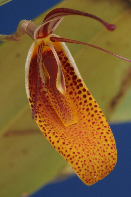 Found in Meta Colombia in wet montane forests at elevations around 550 meters as a mini-miniature sized, hot to warm growing epiphyte with erect ramicauls enveloped by 6 to 7 thin, whitish, loose, compressed, more or less imbricating sheaths and carrying a single, apical, erect, coriaceous, ovate, subacute, broadly cuneate to rounded below into the twisted petiolate base leaf that blooms in the late summer and early fall on a fascile of slender, 1.4 to 2" [3.5 to 5 cm] long, successively single flowered inflorescence arising on the back of the leaf and has a thin, tubular floral bract.
