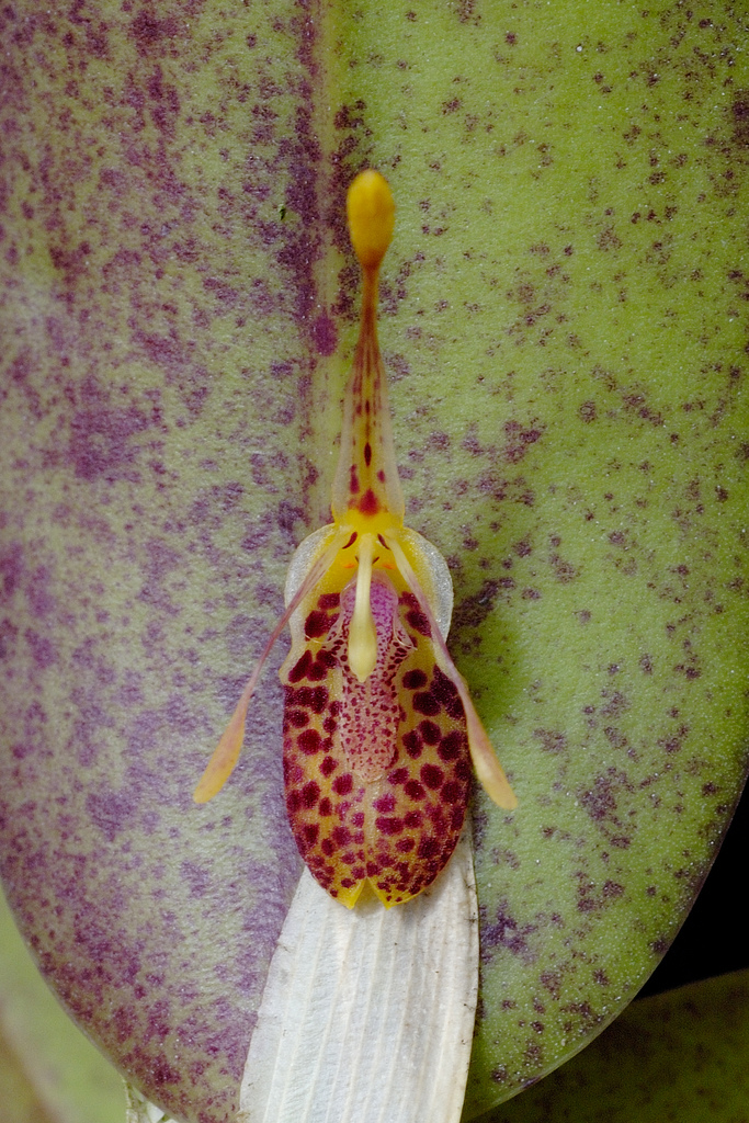 This miniature to small sized, epiphytic, caepitose, warm to cool growing species is found from Mexico, Belize, Guatemala, Honduras, El Salvador, Nicaragua, Costa Rica, Panama, Colombia Ecuador at elevations of 300 to 2500 meters in tropical and montane rainforests with thin ramicauls covered with scarious sheaths and a single, apical, lanceolate or oblong, coriaceous, acute to obtuse leaf where it blooms on 1 to 2, 1/2" [2 cm] long fasciles that produce several successive opening, faintly fragrant flowers appearing in the summer through winter and are held near the leaf base. Grows well both mounted and in a pot with chopped tree fern, pine bark and chopped sphagnum in cool to warm temperatures with semi-shade and high humidity.