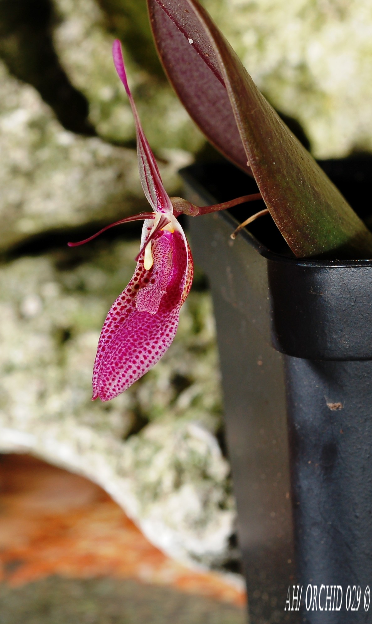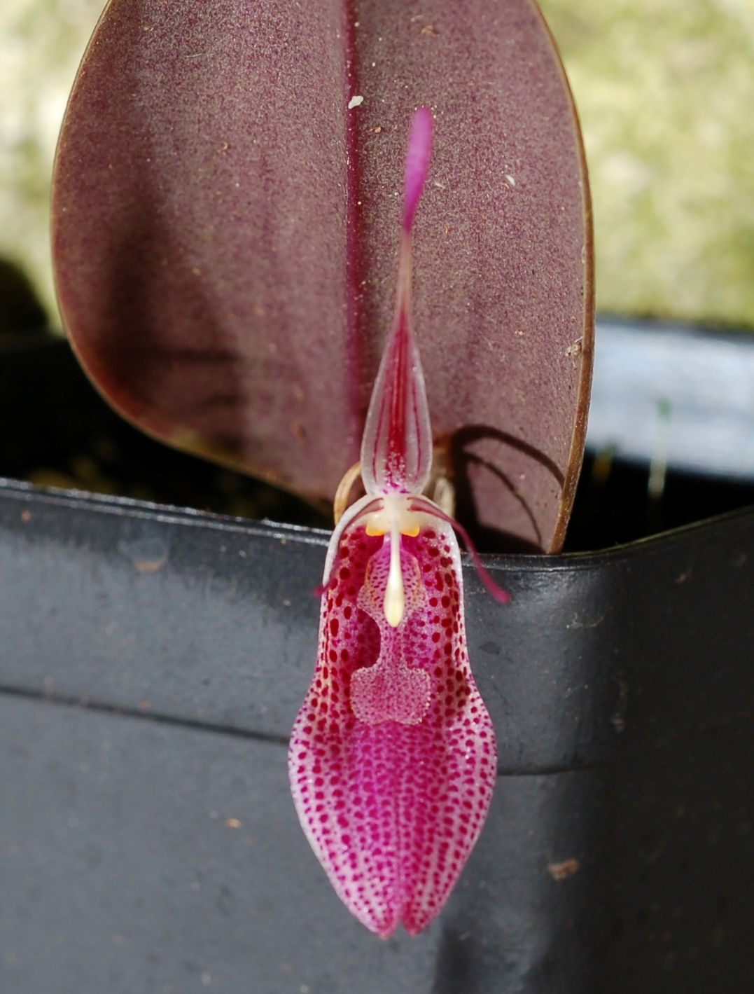 Found in central Colombia near Fusagasuga' in cloud forests as a mini-miniature sized, cool growing epiphyte with an erect ramicaul enveloped by 5 to 10 whitish, loose, compressed, black spotted, somewhat imbricating sheaths and carrying a single, apical, erect, coriaceous, somewhat purple suffused beneath, elliptical-ovate, subacute, basally broadly cuneate or rounded then contracted into a twisted petiolate base leaf that blooms in the later spring and earlysummer on a slender, 1.6 to 3.6" [4 to 9 cm] long, on the back of the leaf, successively single flowered in a fascile inflorescence with thin tubular flroal bracts.