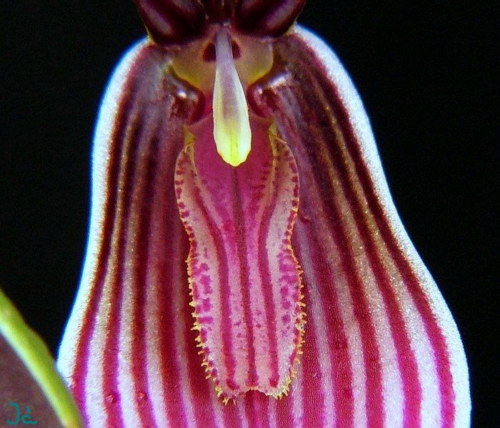 Found in southern Colombia in the department of Narino in cloud forests at elevations around 1650 meters as a miniature to small sized, cool growing epiphyte with erect ramicauls enveloped by 5 to 7 whitish, loose, compressed, somewhat imbricate sheaths with the lower being black spotted and carrying a single, apical, erect, coriaceous, purple suffused, ovate, obtuse, broadly to cuneate base contracted into hte twiated petiolate base leaf that blooms in the spring on a slender, 1.2 to 1.6" [3 to 4 cm] long, successively single floewred inflorescence arising on the back of the leaf and held in a fascile and carrying a thin, tubular floral bract.