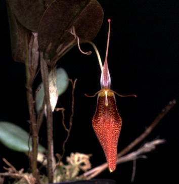 Found in Venezuela in cloud forests at elevations around 2500 meters as a mini-miniature sized, cold growing epiphyte with erct ramicauls enveloped by 5 to 65, whitish, compressed, unspotted, more or less imbricating sheaths and carrying a single, apical, erect, coriaceous, purple suffused beneath, ovate, acute to subacute, basally rounded and contracted into the twisted, petiolate base leaf that blooms in the summer on a slender, 2.8" [7 cm] long, on the back of the leaf, single flowered inflorescence with a thin, tubular floral bract.