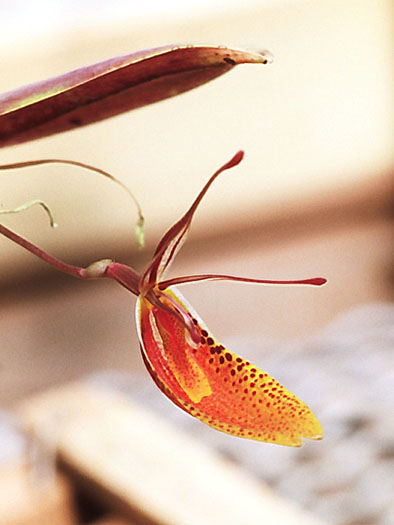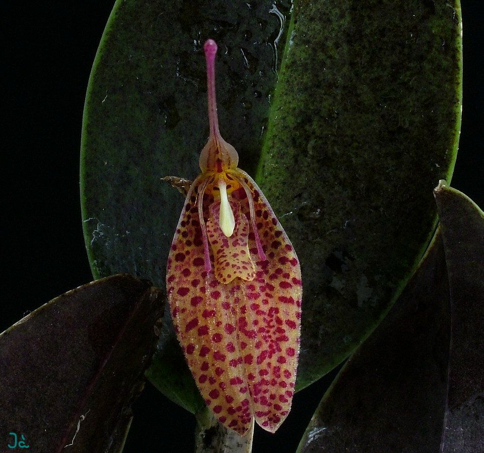 Found in Norte de Santander Colombia in the eastern cordillera near Venezuela in cloud forests at elevations around 2100 meters as a miniature sized, cool growing epiphyte with erect, stout ramicauls enveloped basally by 4 to 6, thin, whitish, loose, compressed, somewhat imbricating, lightly black spotted, disitichous sheaths and carrying a single, apical, erect, coriaceous, purplish beneath, elliptical-ovate, subacute to obtuse, cuneat to rounded base contracted into the twisted petillate base leaf that blooms in the late winter and spring on a slender, .8 to 1" [2 to 2.5 cm] long, successively single flowered inflorescence held in a fascile and arising on the back of the leaf and carrying a thin, tubular floral bract. .