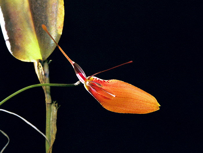 A Colombian species found on the eastern slopes of the central cordillera in cloud forests at elevations of 1600 to 1700 meters as a miniature to small sized, warm to cool growing epiphyte with erect ramicauls enveloped basally by 6 to 7, thin whitish, loose, compressed, somewhat imbricating sheaths and carrying a single, apical, erect, coriaceous, often suffused with purple beneath, elliptical ovate, subacute, cuneate to rounded basally contracted into the twisted petiolate base leaf and blooms in the spring and fall on a terminal, slender, single flowered inflorescence arising on the back of the leaf and carrying a thin, tubular floral bract..