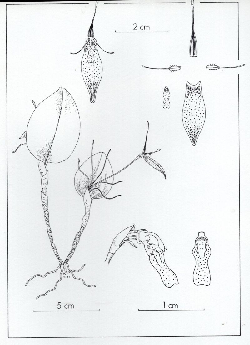 Found in southeastern Ecuador in wet cloud forests at elevations of 1500 to 1600 meters as a miniature sized, warm to cool growing epiphyte with erect ramicauls completely enveloped by 4 to 8, thin, whitish, compressed, loose, oblique, imbricate, acuminate sheaths and carrying a single, apical, round, acute, abruptly narrowing below into the cuneate base leaf that blooms in the summer on a fascile of 2" [5 cm] long, successively single flowered inflorescence held in a fascile and arising on the back of the leaf with a tubular floral bract.