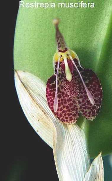 Found in Mexico, Guatemala, El Salvador, Honduras, Nicaragua, Costa Rica, Panama and Colombia to Peru in wet montane forests at elevations of 1200 to 1330 meters as a miniature sized, warm to cool growing epiphyte with a thin ramicaul completely enveloped by inflated, apiculate sheaths and carrying a single, apical, bright green, infused with purple towards the edges, coriaceous leaf that is tridenticulate apically and basally has a short petiole from which arises at any time of the year with various, 2/5" [2 cm] long, single flowered inflorescence held on the back of the leaf. Similar to Resrepia muscifera but differs in the linear-filiform petals and the two filiform, falcate caudae on the lip.