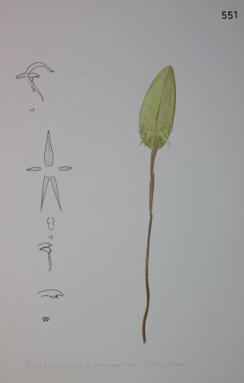 References W3 Tropicos, Kew Monocot list , IPNI ; Repertorium Specierum Novarum Regni Vegetabilis Schlechter 1920 as Pleurothallis microptera; Venezuelan Orchids Illustrated Vol 3 Dunsterville & Garay 1966 as Restrepiella microptera; Icones Pleurothallidinarum VIII Systematics of Lepanthopsis, Octomeria subgenus Pleurothallopsis, Restrepiella, Salpistele and Teagueia Luer 1991 as Restrepiopsis microptera drawing fide; Native Colombian Orchids Vol 4 COS 1992 as Restrepiopsis microptera photo fide; Native Ecuadorian Orchids Vol 4 Dodson 2003 photo & drawing fide; Orquideas de Farallones de Cali Galindo-Tarazona, Haelterman, Zuluaga Trochez and Sebastian Moreno 2020 photo fide