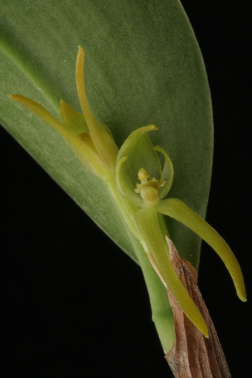 Found in Colombia, Ecuador and Peru at elevations of 1700 to 2400 meters as a small to medium sized, cool to cold growing epiphyte or terrestrial with erect, stout ramicauls enveloped by 7 to 11, imbricating, ribbed, tubular sheaths and carrying a single, apical, erect, thickly coriaceous, elliptical, subacute, cuneate below into the sub-petiolate base leaf that blooms in the spring summer and fall on a fascile of .1 to .15" [2 to 3 mm] long, successive single flowered inflorescence arising from below the apex of the ramicaul