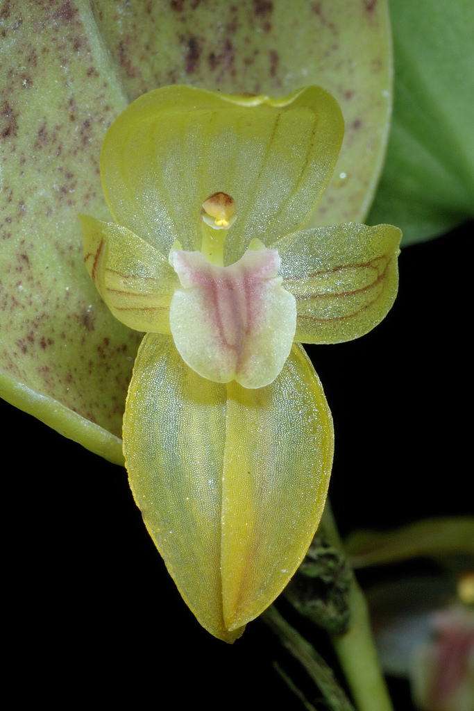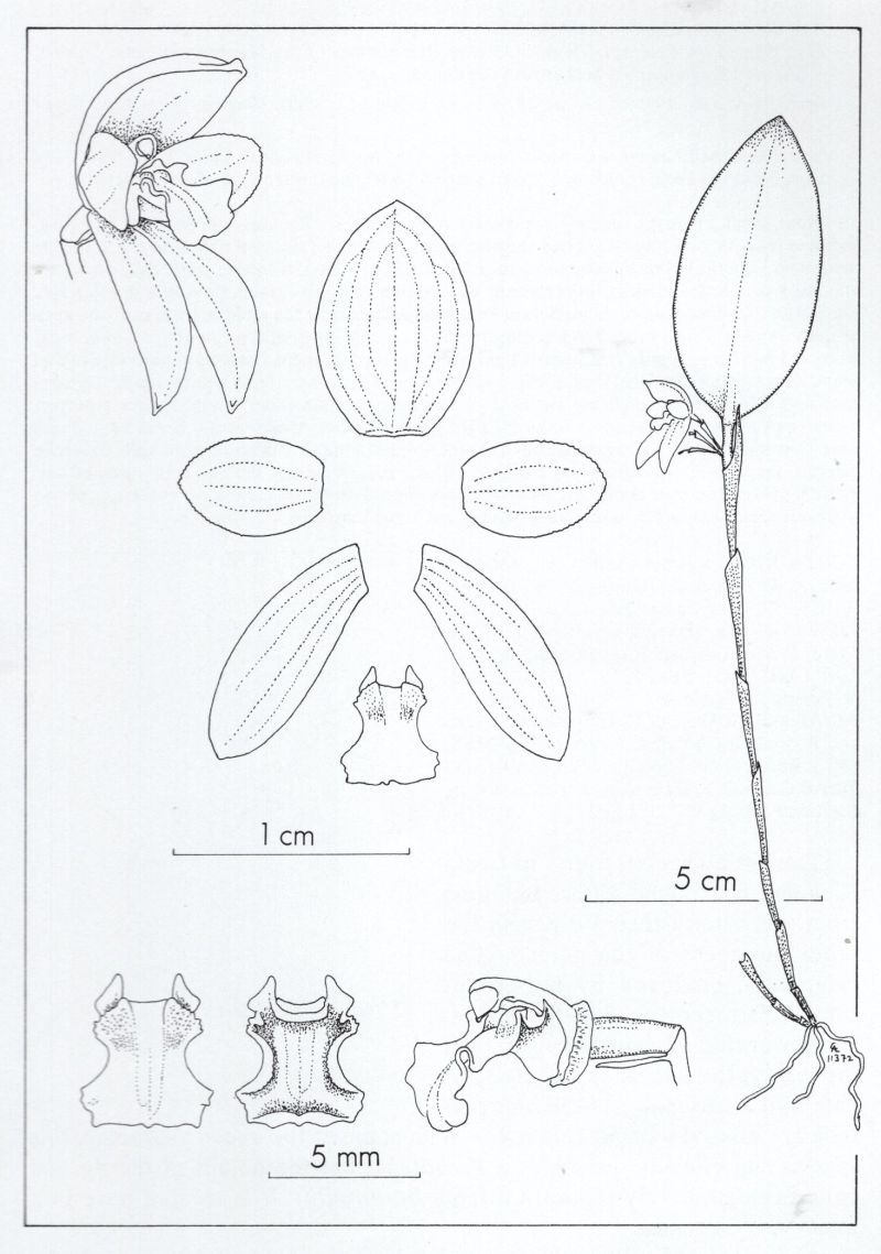 Found in Antioquia department of Colombia at elevations around 2050 meters as a miniature sized, cool to cold growing epiphyte with slender, erect ramicauls envloped basally by 4 to 7 imbricating, ribbed, tubular sheaths carrying a single, apical, erect, thickly coriaceous, elliptical, subacute to obtuse leaf with the base cuneate into the petiole and blooms in the spring on a successively single flowered, fasiculate, 1/16" to 1/8" [3 to 7 mm]long inflorescence arising from near the apex of the ramicaul. This species has the largest flowers of the genus.