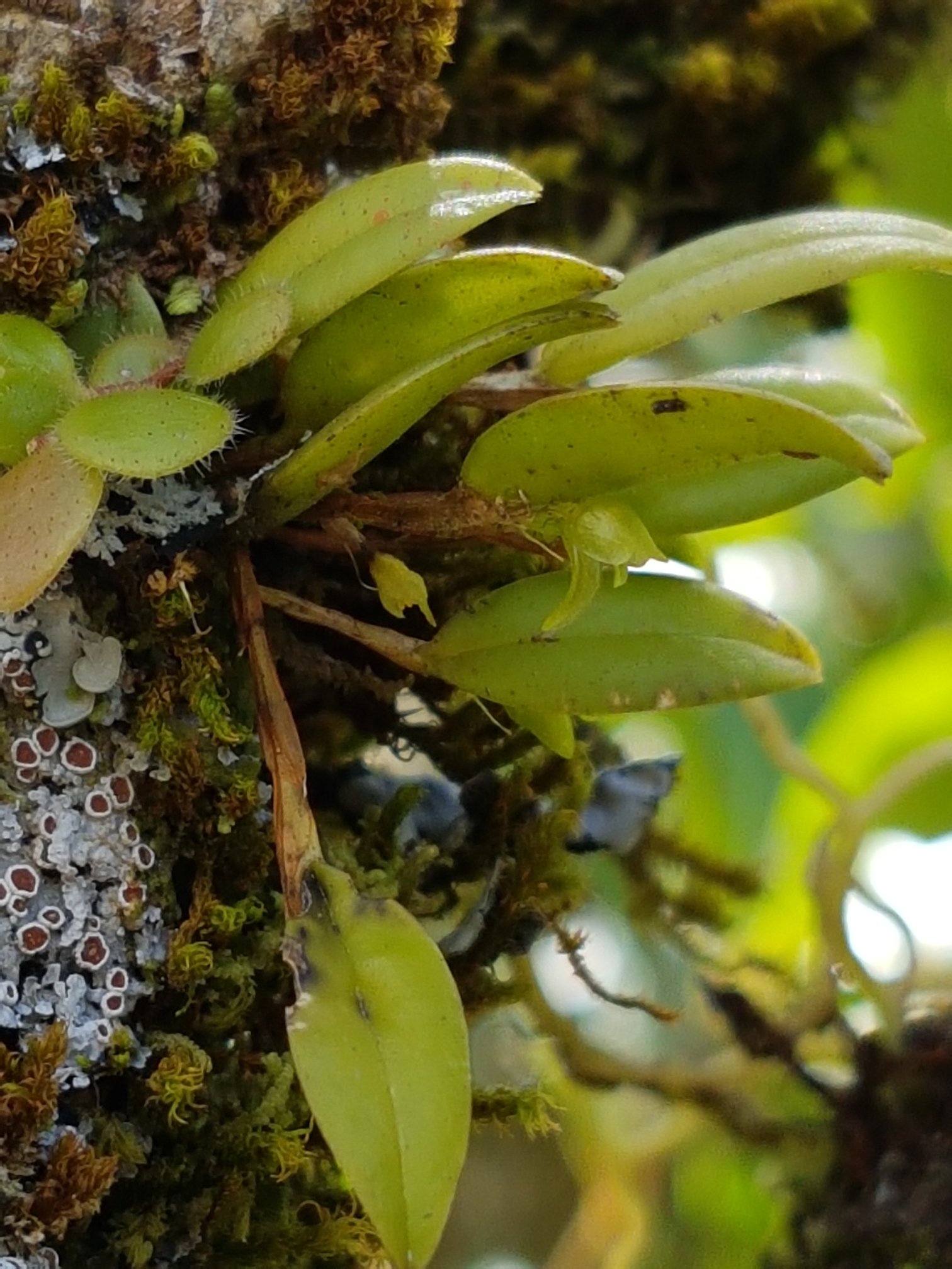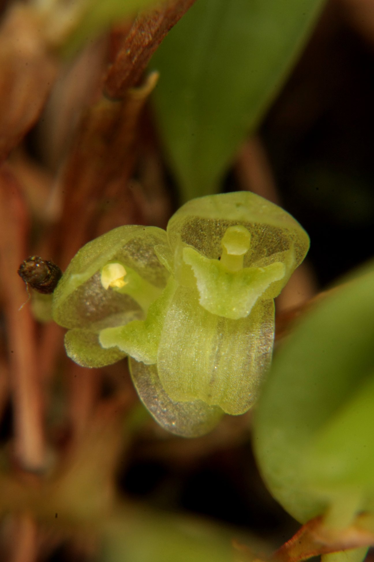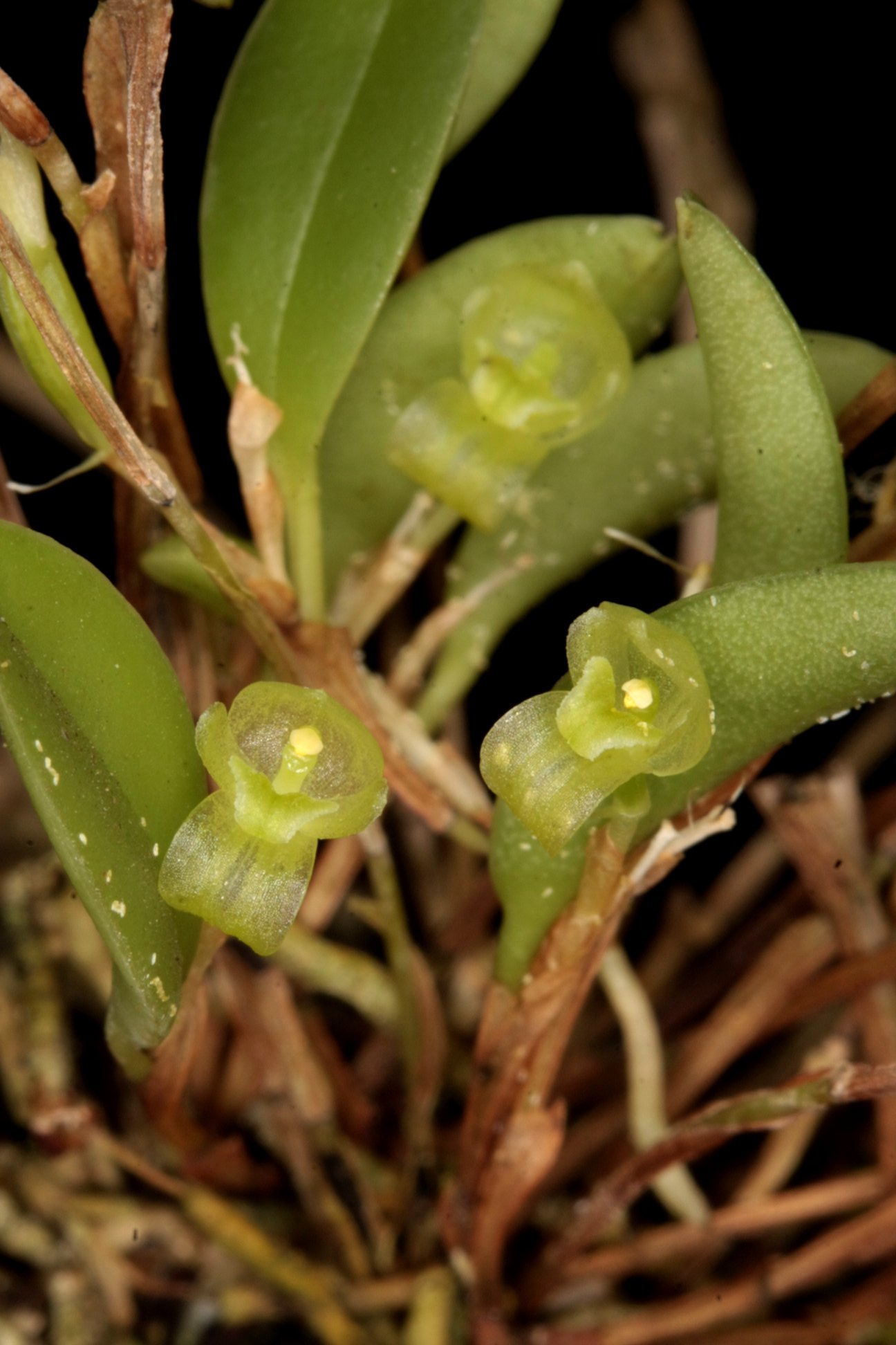 Found in Guatemala, Nicaragua, Costa Rica, Panama, Colombia? and Ecuador in montane cloud forests at elevations around 1200 meters as a mini-miniature sized, warm growing epiphyte with erect ramicauls enveloped basally by 2 reddish sheaths and carrying a single, apical, erect, coricaeous, dorsally carinate, tridenticulate, elliptic, acute, gradually narrowing below into the petiolate base leaf that blooms in the late fall and early winter on a .6" [1.5 cm] long, single flowered inflorescence arising from the base of the ramicaul and enveloped by a few scarious bracts.