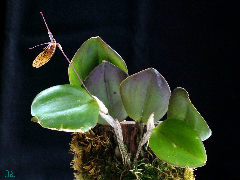 Found in the Yungas of Bolivia at elevations of 1800 to 2100 meters as a small sized, cool to cold growing epiphyte with erect ramicauls enveloped basally by 4 to6 thin, loose, whitish, compressed, somewhat imbricate, disitichous sheaths and carrying a single, apical, erect, coriaceous, ovate, obtuse, broadly rounded base contracted into the twisted petiolate base leaf that blooms in the winter, spring and summer on a slender, 1.6 to 2.4" [4 to 6 cm] long, successively single flowered inflorescence held in a fascile and arising on the back of the leaf with a thin, tubular floral bract..