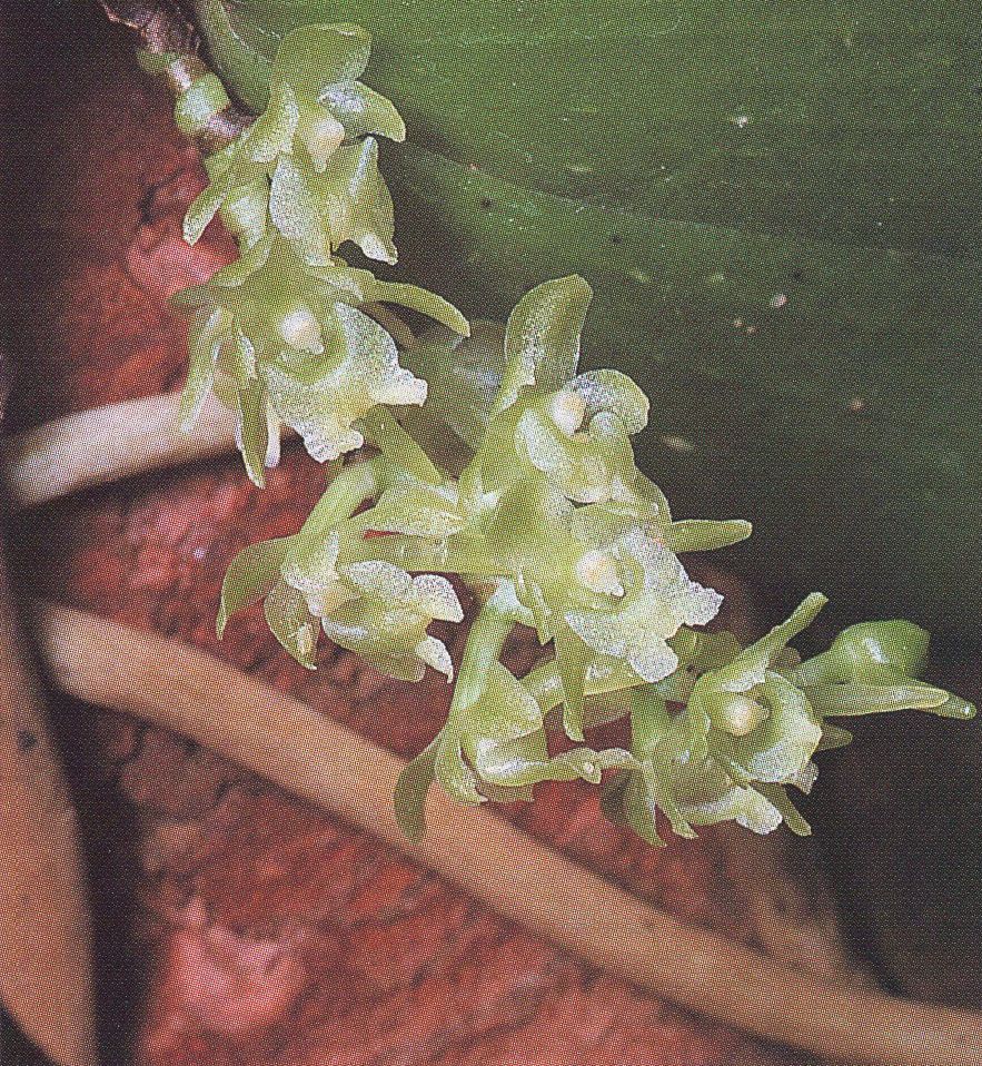 Found in Gabon, Zaire, Burundi, Rwanda and Uganda in humid forests and thickets at elevations of 1300 to 2200 meters as a medium szied, warm to cold growing epiphyte with an elongate, usually pendent stem carrying to 20, basally twisted so as to all lie in one plane, elliptic to oblong-ellitic, Unequally bilobed apically leaves with rounded lobes that blooms in the fall on usually several, 2 to 4" [5 to 10 cm] long, densely 15 to 30 flowered inflorescence