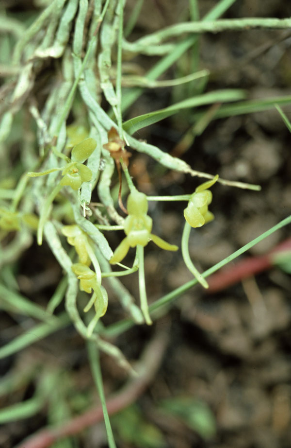 Found in Tanzania in montane mist forests on small trees at elevations of 1500 to 2400 meters as a small sized, cool to cold growing epiphyte with a pendent to spreading stem carrying 2 to 6, clustered towards the apex, falcate, linear-ligualte, unequally bilobed and rounded apically, basally tweisted leaves that blooms in the summer on 1 to few, pendent, [3.5 to 19 cm] long, 5 to 10 flowered inflorescence carrying unpleasantly scented flowers.