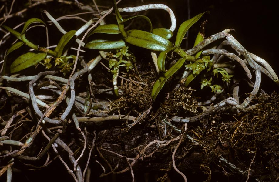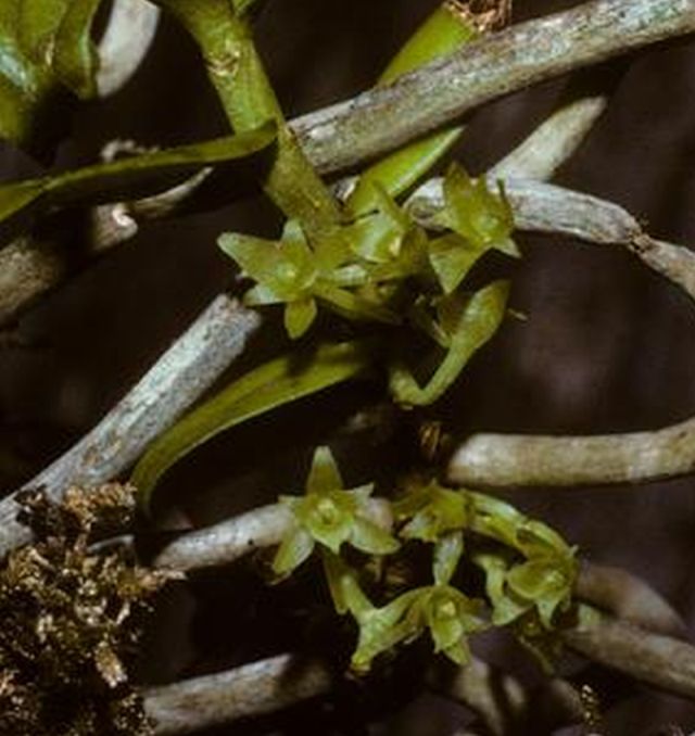Found in Kenya on twigs and branches bushes and trees usually amongst mosses at elevations of 2300 to 2750 meters as a mini-miniature to miniature sized, cold growing epiphyte with prominent roots holding the plant away from the substrate with short stems carrying 2 to 6, greyish green, linear to narrowly lanceolate, unequally bilobed apically leaves that blooms at most any time of the year on usually several, arising below the leaves [.8 to 1.6" [2 to 4 cm] long, 4 to 9 flowered infloresccence