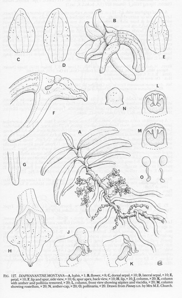 References W3 Tropicos, Kew Monocot list , IPNI ; Orchids of East Africa Piers 1968 as Angraecum montanum; AOS Bulletin Vol 49 #6 1980 as Ang montanum photo fide; *Rudolph Schlechter Die Orchideen Band 1B lieferung 16/17/18 945-1128 Brieger 1986; An Introduction to the Angraecoid Orchids of Madagascar Hillerman & Holst 1986 as Angraecum montanum; Flora of Tropical East Africa Orchidaceae Part 3 Cribb 1989 as Diaphananthe montanua drawing fide; Orchids of Kenya Stewart & Campbell 1996 as Diaphananthe montanum photo fide; Angraecoid Orchids Stewart, Hermans, Campbell 2006 photo good
