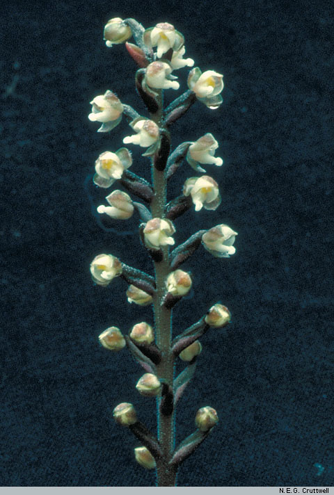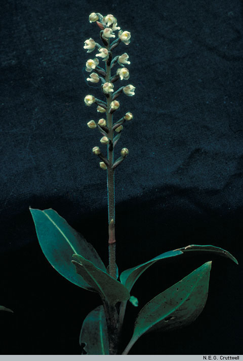 Found in New Guinea inmontane forests at elevations of 2000 to 2650 meters as a medium sized, cold growing terrestrial with a decumbent, stem-like rhizome giving rise to a terete, glabrous stem carryiong 3 to 5, erect, patent to suberect, obliquely elliptic, acuminate, basally rounded, glabrous, petilate base leaves that blooms in the summer and fall on erect, 6.8" [to 17 cm] long, laxly many flowered, elongated, cylindrical inflorescence witha few distant bracts and ovate, lanceolate, acuminate, usually a little shorter than the ovary floral bracts.