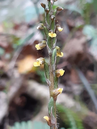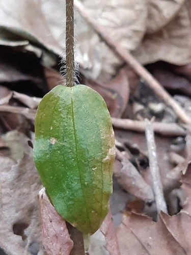Found in Arunachal Pradesh state of India without locational data as a miniature sized terrestrial with a decumbent, fleshy, green tingfed brown stem carrying a single?, ovate-elliptic, acute, sheathing at base leaves that blooms in the fall on an erect, 3.2" [8 cm] long overall, shortly pubescent, lax, 7 to 8 flowered inflorescence with ovate-lanceolate, single nerved, sparsely gland dotted floral bracts and carrying resupinate flowers.