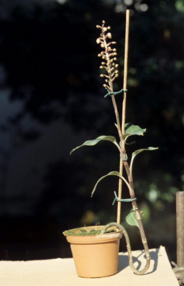 Found in New Guinea, the Moluccas, the Bismark Archipelago, the Solomon Islands, New Caledonia and Queensland Australia in rainforests often on large boulders near streams at elevations of 100 to 800 meters as a miniature to small sized, hot to warm growing terrestrial with 5 to 9, scattered along the stem, narrowly ovate, purplish green to bronzed with a broad central white line, velvety leaves that blooms in the winter on an erect, 4 to 8" [10 to 20 cm] long, 1 to 4 flowered inflorescence.