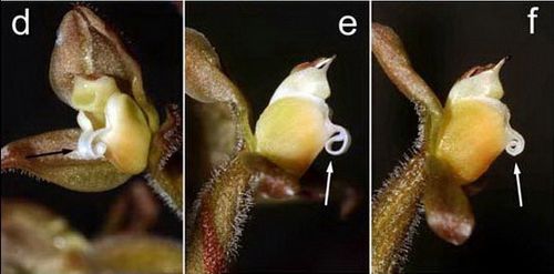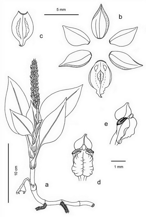 Found in Guangdong province of China, Japan, the Ryukyus, Taiwan and Vietnam in humid broad-leaved shady forests on silicate soils at elevations around 400 to 1300 meters as a small sized, warm to cool growing terrestrial with a red brown, ascending stem carrying 2 to 5, oblique-ovate, acute, velvety dark green to greenish-brown, with white median stripe, gradually narrowing below into the petiolate base leaves that blooms in the late spring and summer on a terminal, erect, .8 to 1.2" [2 to 3 cm] long, finely sparsely pubescent, with 1-2 cuneate, pinkish hyaline bracts, rachis to 3.2" [8 cm] long, finely pubescent, many flowered inflorescence with brownish red, ovate-lanceolate, margin ciliate, acuminate, lower ones longer than the ovary floral bracts and carrying non resupinate, hardly opening flowers.