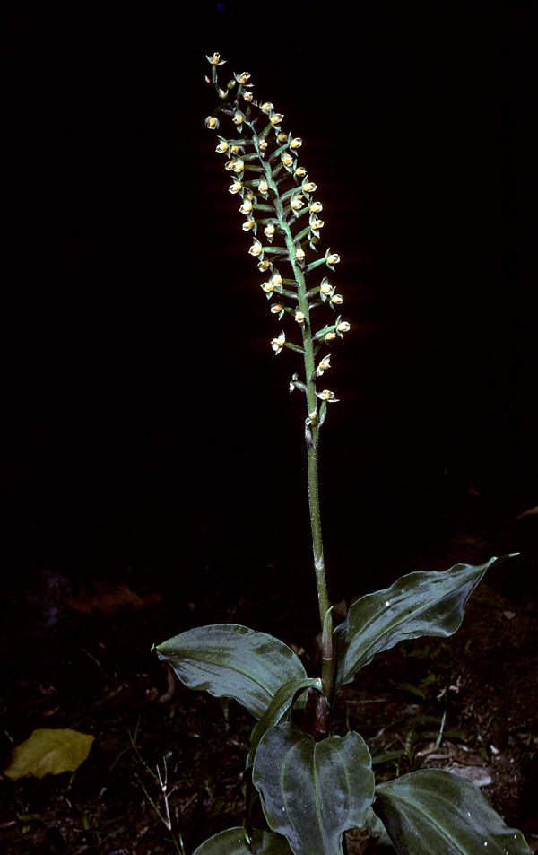 Found in Java and the Lesser Sunda Islands at elevations around 1200 meters as a small sized, warm growing terrestrial with an erect stem carrying 6, well above the ground, dark green, red median stripe above, red beneath, lanceolate, gradually narrowing below into the petiuolate base leaves that blooms in the late spring on a terminal, erect, 3.6" [9 cm] long, rachis 1.2" [3 cm] long, pubescent, to 9 flowered inflorescence