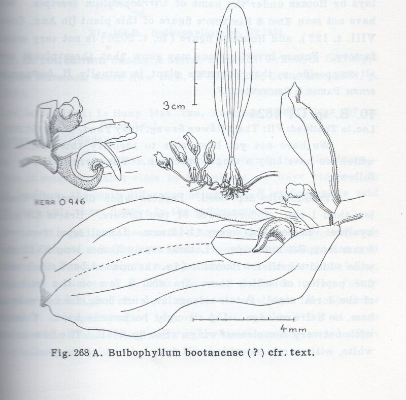 References W3 Tropicos, Kew Monocot list , IPNI ; The Orchids of Burma Grant 1895/95 as Cirrhopetalum bootanense; The Orchids of Sikkim-Himalaya Part 1 King & Pantling 1898 as Cirrhopetalum bootanense drawing; The Orchids of Thailand Seidenfaden & Smitinand 1961 as B bootanense drawing fide but???; The Orchids of Thailand Seidenfaden & Smitinand 1965 corrections; Bulbophyllum and Their Allies Seigerist 2001 as Rhytionanthos bootanense