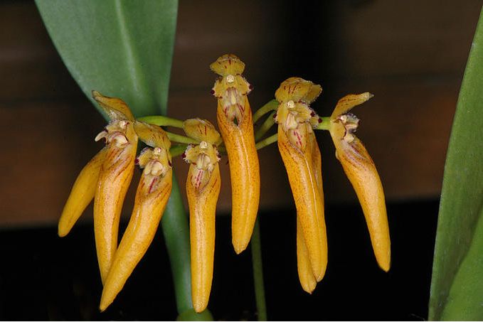 Found in Yunnan province of China, the western Himalayas, Nepal, Sikkim, Myanmar and Thailand in montane forests as a small sized, warm to cold growing epiphyte or lithophyte at elevations of 800 to 2700 meters with 1.2 to 2.4" [3 to 6 cm] between each long-ovoid pseudobulb carrying a single, apical, erect, coriaceous, oblong, narrowing below into the petiolate base leaf that blooms in the later spring and summer on a basal, 2 to 3” [5 to 7.5 cm] long inflorescence with imbricate, tubular sheaths and narrowly lanceolate, acute floral bracts and carrying 5 to 9 stinky flowers.