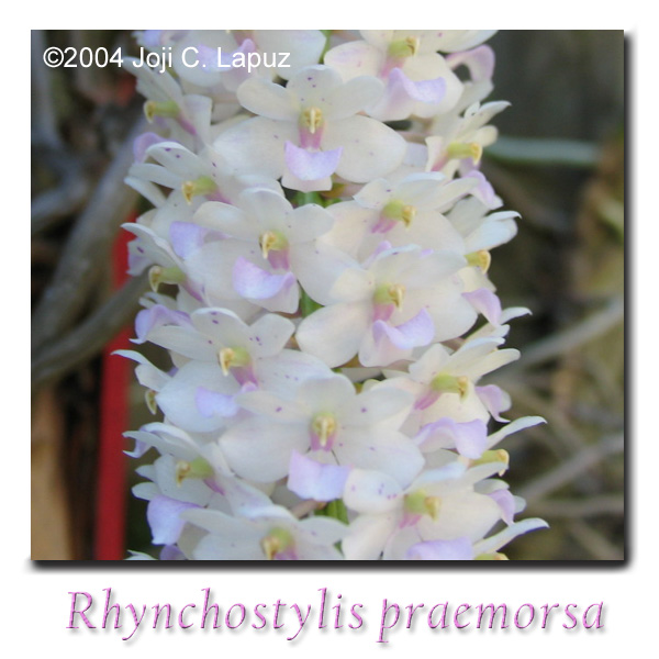 Distinguished from other Rhynchostylis by the "sub-oblique leaf tips with the central vein extending into a small sharp, acute point and smaller flowers. The labellum is narrow witha small sharp upturned and hook-like apicule at the apex and the mentum or spur has a distinct shape". Quote by Wesley Higgins Selbyana 31[1] 40-43 2013