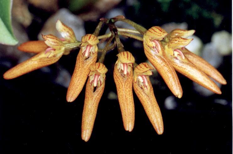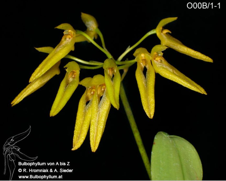 Found in southern Yunnan province of China, Myanmar, Thailand, Laos and India in montane forests at elevations around 2000 meters as a small sized, cool to cold growing, unifoliate epiphyte with garlic clove-like pseudobulbs carrying a single apical, elliptic to oblong-elliptic, petiolate leaf that blooms in the spring on a basal, 3 1/4" [8 cm] long, several flowered, umbellate inflorescence holding the flowers at mid-leaf.
