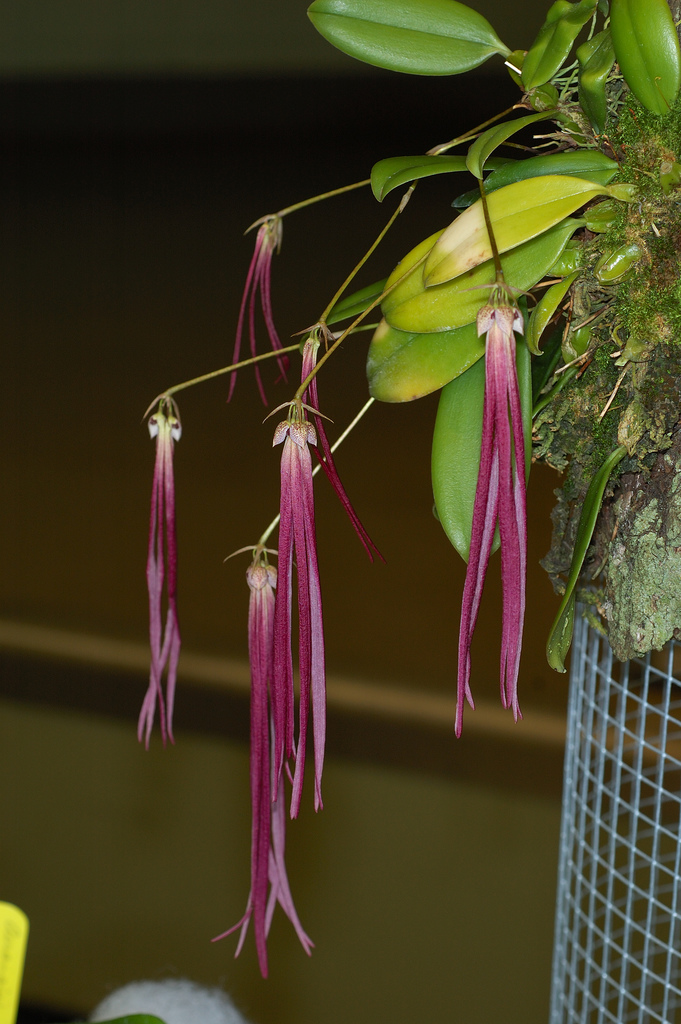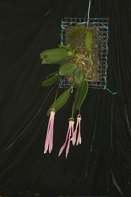 Found in Malaysia, Sumatra and the Philippines in swamp forests at elevations around 1000 to 1500 meters as a mini-miniature sized, cool growing epiphyte with .8 to 1.2" [2 to 3 cm] between each, obliquely ovoid, quadrangular with concave sides pseudobulbs and carrying a single, apical, lanceolate, narrowing into the very short petiolate base leaf that blooms in the summer on an ascending, slender, terete, 4" [10 cm] long, apically thicker, 4 flowered, umbelliform inflorescence that is held at the leaf height.