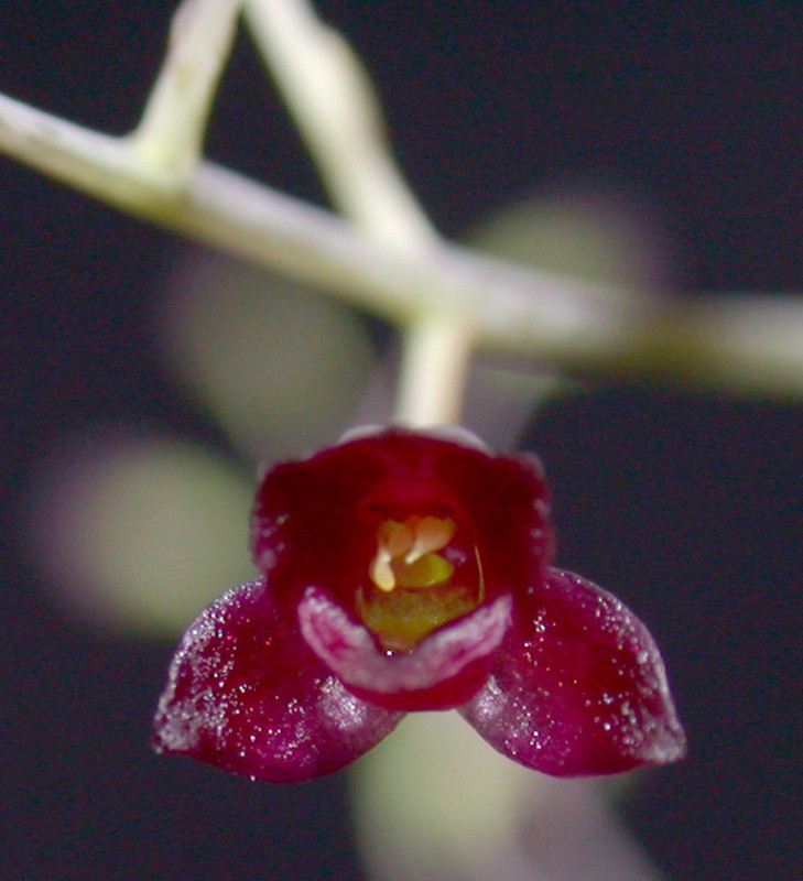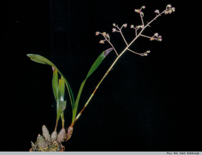 This medium sized, cool to warm growing epiphyte found in Papua and New Guinea in lowland and montane forests at elevations of 800 to 1800 meters with oblong pseudobulbs carrying 2 apical, subcoriaceous, linear leaves that blooms in the winter and late spring on a basal, arcuate to pendant, paniculate, many flowered inflorescence.