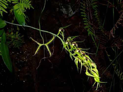 Found in New South Wales Australia at elevations of 400 to 1000 meters occuring in moist sandstone rock crevasses as a miniature sized, cool to cold growing lithophyte with a creeping rhizome giving rise to a cylindrical, short pseudobulb enveloped completely by a scarious tubular sheath and carrying an erect, single, elliptic, acute, petiolate base leaf that blooms in the spring and summer on a terminal, 6" [15cm] long, several to many flowered inflorescence carrying long-lasting flowers.