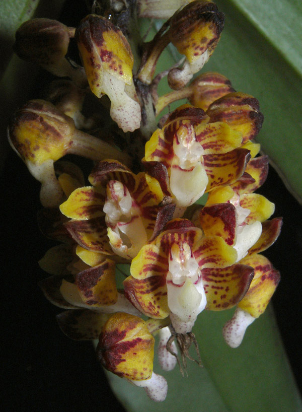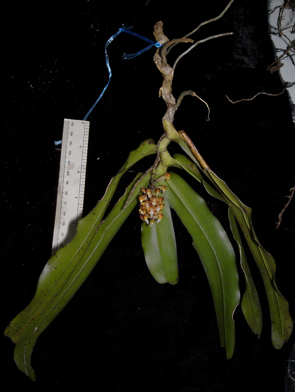 Found in penninsular Malaysia in hill forests at elevations around 300 meters as a small sized, hot growing epiphyte that blooms in the later summer on a stiff, descending, cylindrical, densely, successively 30 to 80 flowered inflorescence
