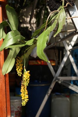 Found in southern Borneo and Sulawesi in montane forests at elevations of 800 to 1500 meters as a medium to large sized, warm to cool growing epiphyte with descending stems carrying 2 ranked, long, narrow leaves that blooms in the fall on an axillary, descending, to 3 branched, 2.4 to 2.8" [6 to 7 cm] long, to 30 flowered inflorescence.
