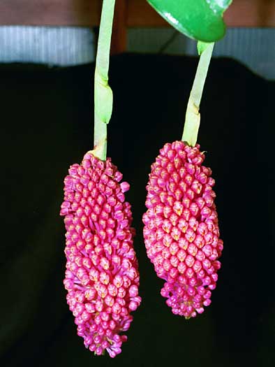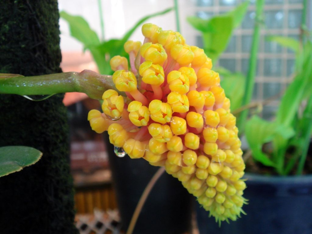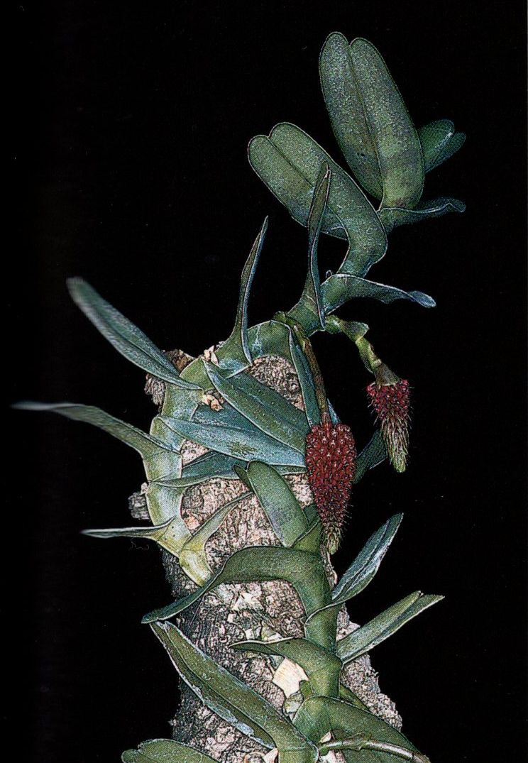 Found in Papua and New Guinea and the Philippines as an epiphyte at elevations over 350 meters occuring on tree trunks as a medium sized, hot to warm growing epiphyte with rather broad, strongly compressed, ancipitous stems carrying several, leathery, 2 ranked, at right angles to the stem, basally clasping leaves that blooms in the fall, winter, spring and summer on a racemose, conical, pendulous, 2.4 to 4" [6 to 10 cm] long, successively many flowered inflorescence that has a third of the flowers open at any one time.