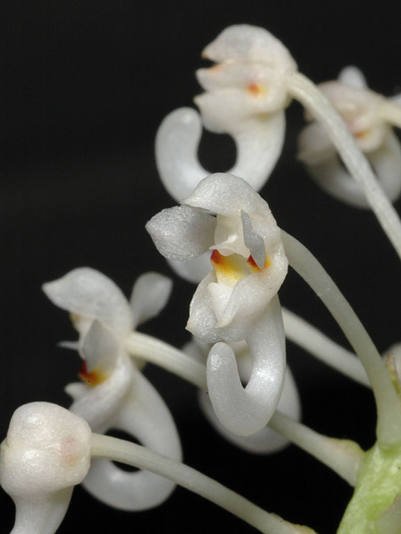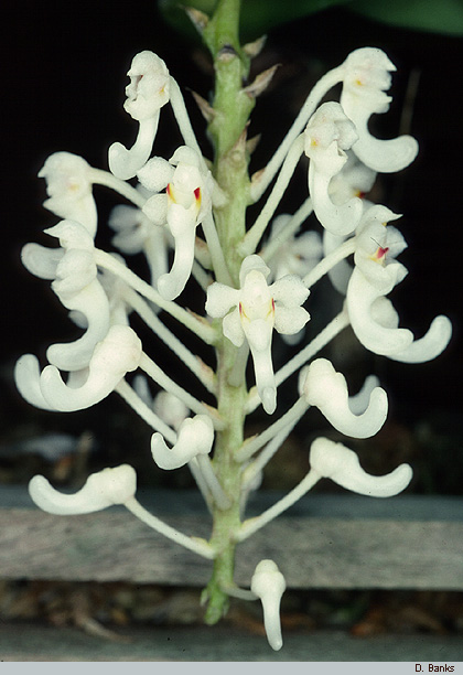 Found on Mindanao in the Philippines on tree trunks in bright light at elevations around 500 to 2900 meters as a medium sized, warm to cold growing epiphyte with erect to semi-pendulous stem carrying leathery, linear, unequally bilobed apically leaves that blooms on a sometimes branching, to 8" [20 cm] long, many flowered inflorescence with sweetly fragrant flowers.