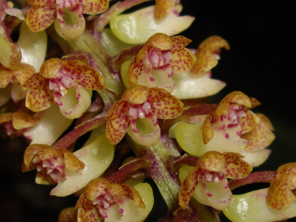Found in Borneo in hill and lower montane forests at elevations of 800 to 2200 meters as a small to medium sized, warm to cold growing epiphtye with a spreading to pendulous stem that roots at the base carrying several, ligulate, undulate marginally, obtusely unequally bilobed apically, purple beneath leaves that blooms in the spring and fall on a simple, racemose, to single branched, densely many flowered, 6" [to 15 cm] long inflorescence with ovate, obtuse, amplexicaul, sterile bracts and triangular, acuminate floral bracts.