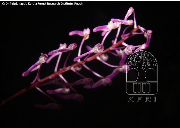 Found in southern India and Sri Lanka in submontane and tropical wet, evergreen forests at elevations uo to 1200 meters as a as a small sized, warm to cool growing, monopodial, pendent growing epiphyte with a nonpseudobulbous, zig-zag to flexuous stem carrying alternate, narrowly linear, unequally bilobed apcially, narrowing below into the clasping base leaves that blooms in the later spring and summer on an axillary, 4.8" [12 cm] long, pendulous, many flowered inflorescence with minute, subulate,floral bracts.