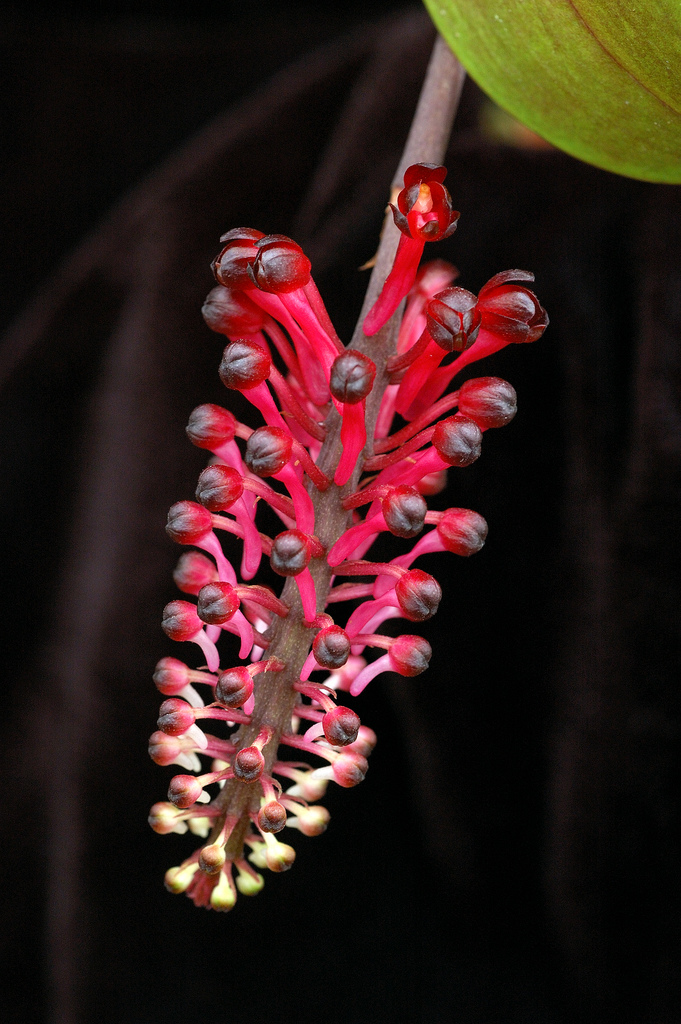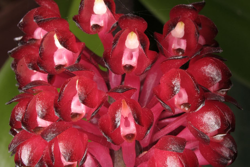 Found in New Guinea in lowland and lower montane forests at elevations of 26 to 1000 meters as a medium sized, hot to warm growing, monopodial epiphyte of the hill forests occuring on twigs and tree branches in high light with stems carrying several, oblong, coriaceous, margins recurved leaves that are mottled purple beneath that blooms on a 8" [20 cm] long, pendulous inflorescence carrying has many [20 to 70], fleshy, long-lasting flowers, which open from the bottom up, all clustered towards the apex and occuring in the winter.