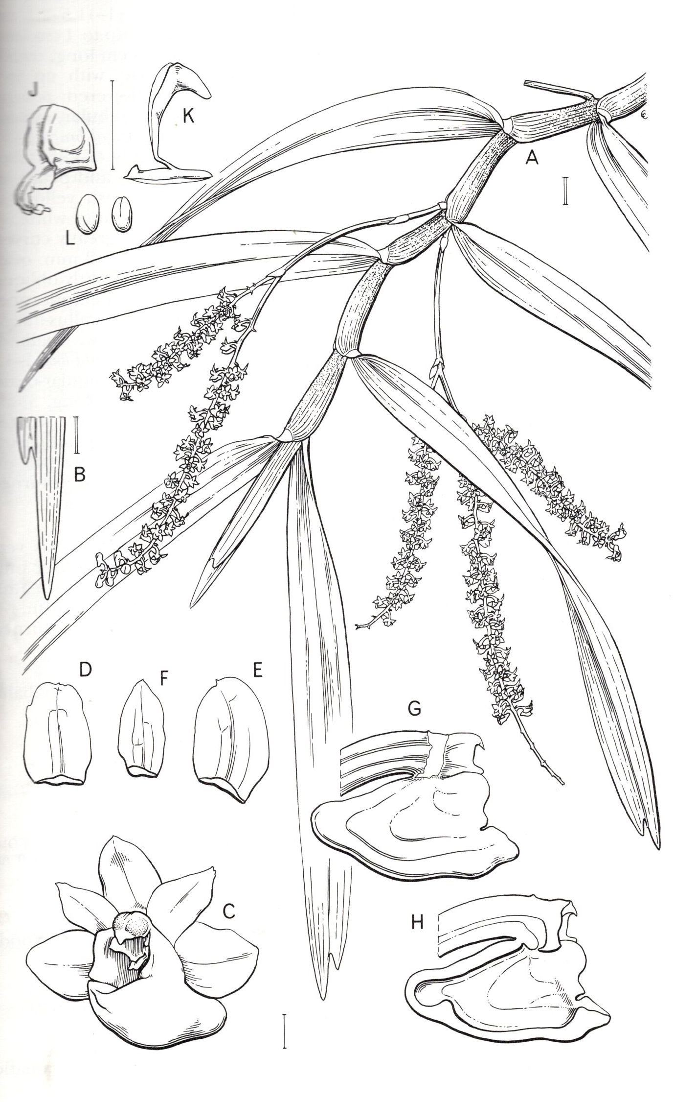 Found in Sabah and Sarawak Borneo in lower montane forests at elevations of 1500 to 2000 meters as a small to medium szied, cool growing epiphyte with a spreading to pendulous stem carrying coriaceous, ligulate, very unequally bilobed, one lobe elongate to 1.6" [4 cm] long, the other short and tooth-like leaves taht blooms fall, winter and spring on a usually paniculate, to 3 branched, sometimes simple, peduncle 2 to 4.6" [5 to 11.5 cm] long, 2 to 3 remote sterile bracted, , rachis 3.2 to 6" [8 to 15 cm] long, branches 1.8 to 3.6" [4.5 to 9 cm] long, densely many flowered inflorescence with ovate, aristate floral bracts. and carrying flowers that do or do not have fragrance if so scented of cucumber .