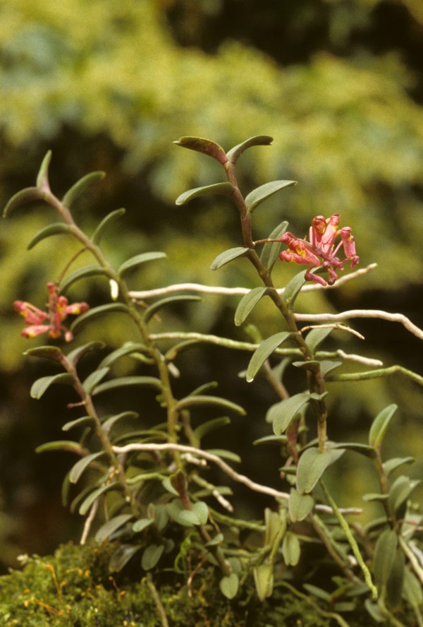 Found in India and Sri Lanka in submontane or tropical wet evergreen forests at elevations up to 1850 meters as a large sized, hot to cool growing epiphyte with an elongate, nonpseudobulbous stem carrying many, alternate, linear, apically unequally bilobed, basally clasping leaves that blooms in the late winter and spring on an axillary, slender, 6" [15 cm] long, few to several flowered inflorescence with triangular-ovate, acute to rounded floral bracts