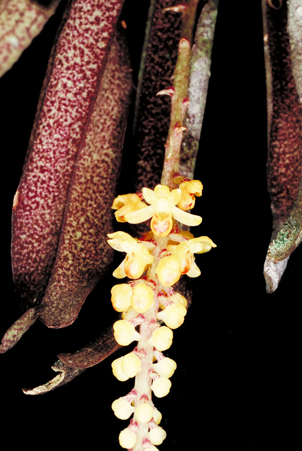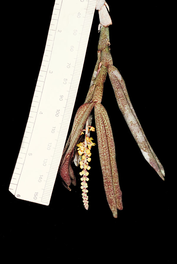 Found in Sulawesi in montane forests as a miniature sized, cool growing epiphyte with leaves that on top are varigated yellow green with rows of purple spots and below densely purple spotted that blooms in the late summer and earlier fall on a pendent, 2.4 to 4.8" [6 to 12 cm] long, successively 6 to 10, to 60 flowered inflorescence
