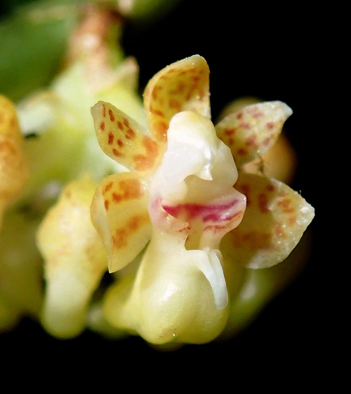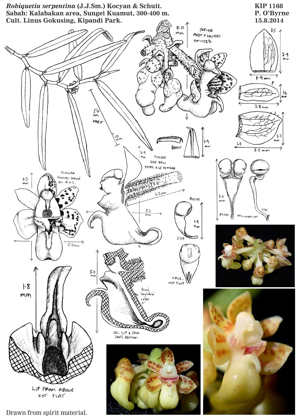 The best diagnostic feature to separate this species from the very similar Robiquetia glomerata is the shape of the side lobe of the lip, R serpentina has a single notched side lobe, R glomerata has a profoundly 2 toothed side lobe.